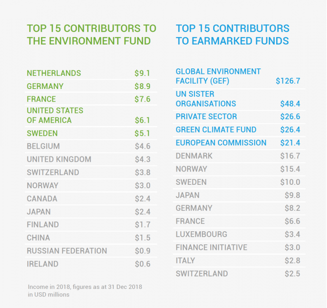 Desde 2012, os membros do PNUMA abrangem todos os 193 Estados Membros da ONU, responsáveis pelo financiamento de nosso programa. Em 2018, 90 Estados-Membros contribuíram para o Programa das Nações Unidas para o Meio Ambiente. Como o sucesso do nosso trabalho depende muito das contribuições feitas, incentivamos todos os Estados Membros a contribuir com sua parte justa para o nosso Fundo para o Meio Ambiente. Atualmente, os 15 principais parceiros de financiamento fornecem cerca de 90% da receita